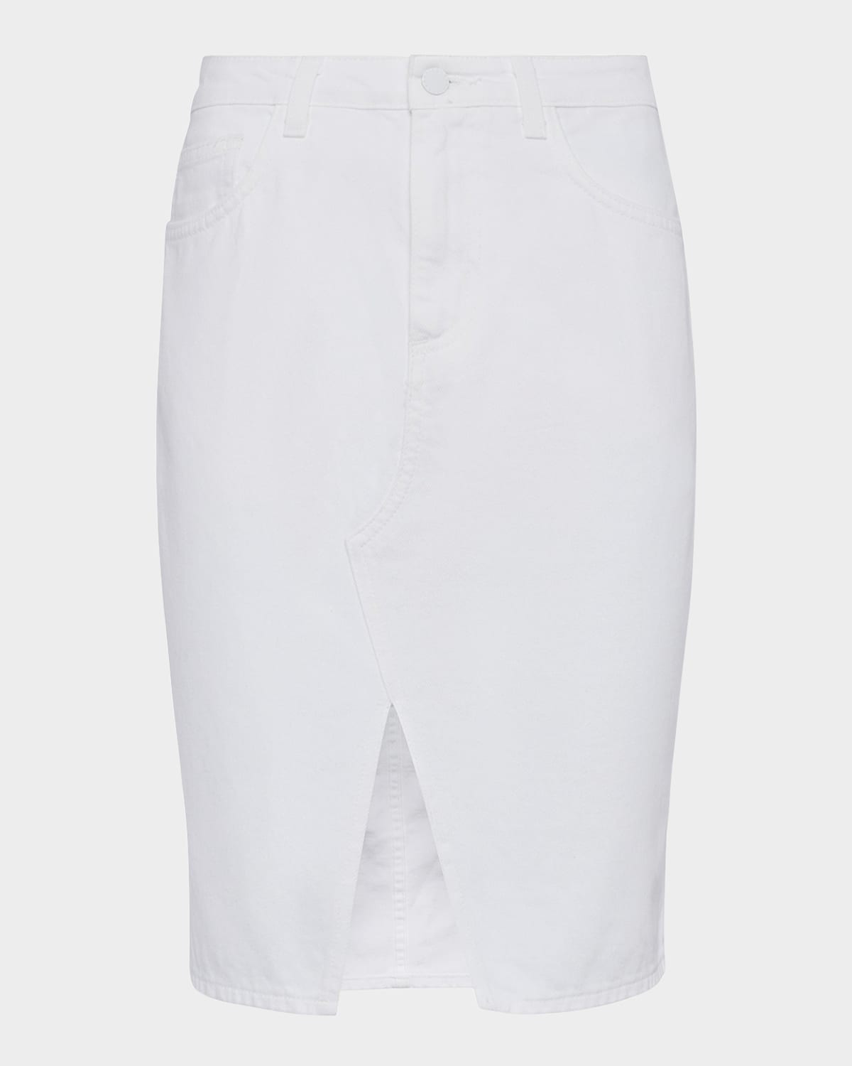 - L'Agence "Tylee" knee-length skirt in crisp white denim - High rise - Five-pocket style - Pencil style - Center front slit - Button/zip fly; belt loops - Cotton - Made in USA