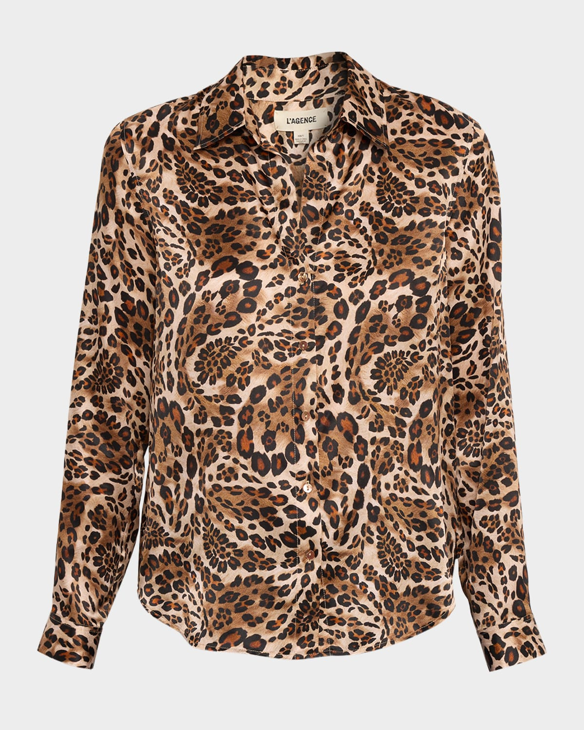 - L'Agence "Tyler" luxurious silk charmeuse blouse decorated with a leopard print - Point collar; button-front - Long sleeves with button cuffs - Slim fit - Rounded high-low hem - Silk - Dry clean - Imported
