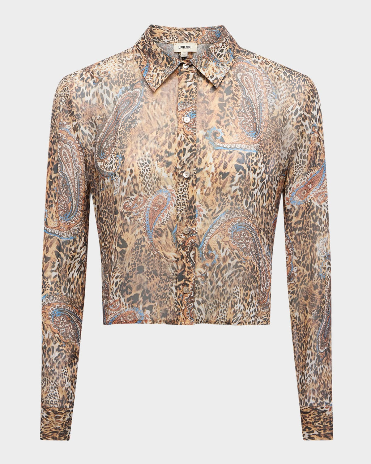 Combining two classic patterns, the "Cosette" blouse by L'Agence is printed with a mix of bold leopard and paisley Shirt collar; button front Long sleeves; button cuffs Centercut back slit Relaxed fit Highlow hem Viscose Imported