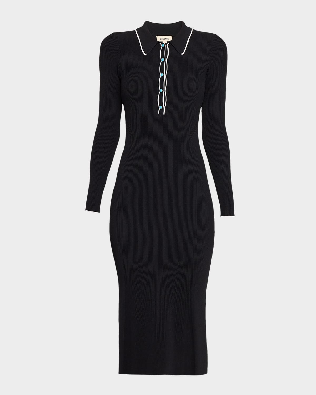 - L'Agence "Yaretzi" ribbed midi dress embellished with turquoise buttons - Point collar; button-placket - Long sleeves - Figure-hugging silhouette - Hem falls below the knee - Slipover style - Viscose/nylon/polyamide/spandex - Imported