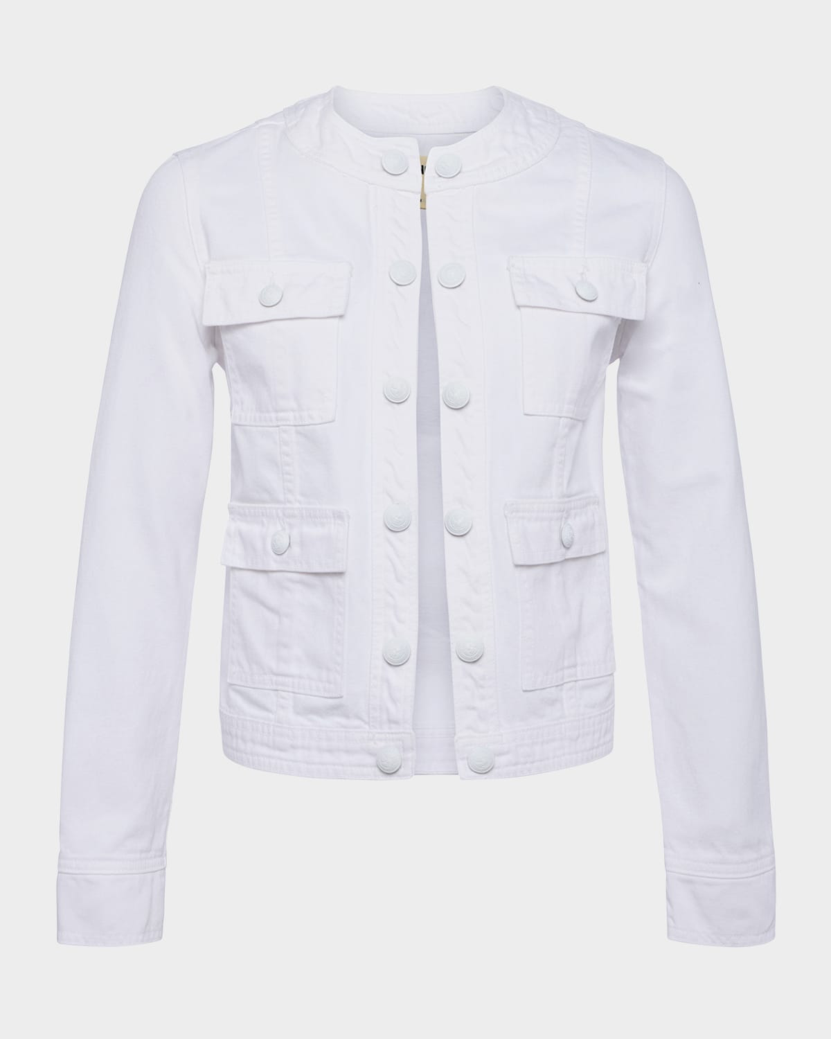 L'Agence "Yari" jacket in colored denim Round neckline Long sleeves with button cuffs Dual chest and hip pockets Classic fit Hem sits at the hip Openfront Cotton Made in USA