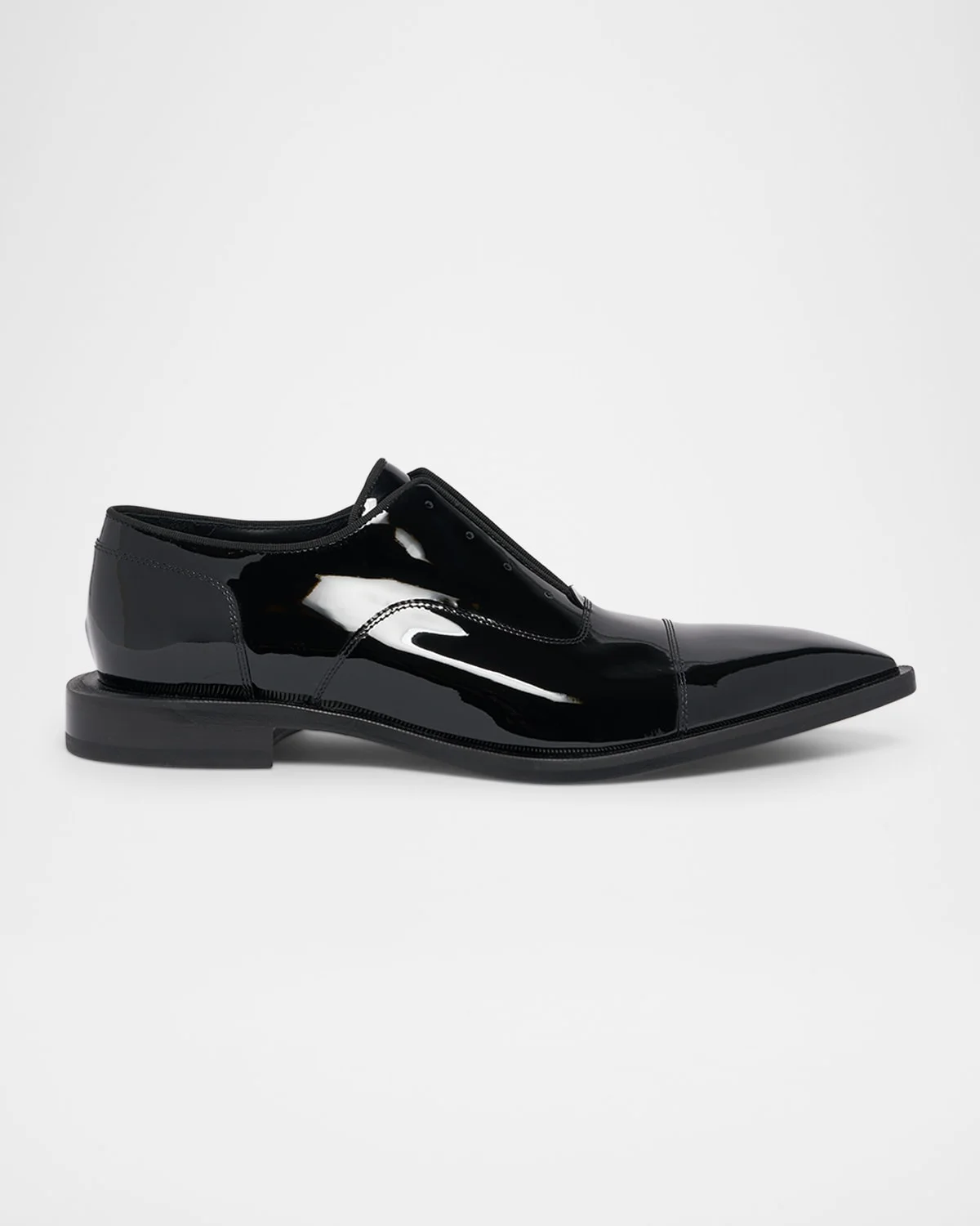 The Lanvin glossy leather oxford shoes combine tradition and modernity by adding a pointed toe, the symbol of the Winter 2025 collection. Stacked heel Pointed cap toe Holes for decorative laces Blue insole with an embossed logo Leather lining Professional cleaning recommended Made in Italy