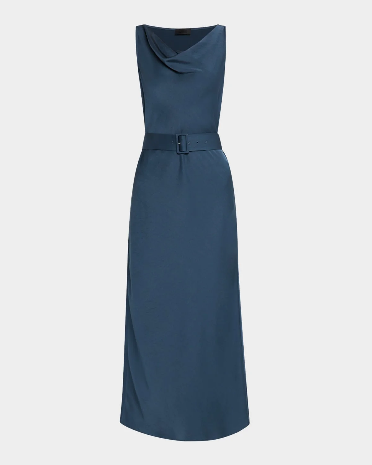 LAPOINTE Lightweight satin dress featuring a wide selfbelt Cowl neckline Sleeveless Sheath silhouette Hem falls below the knee Slipover style Polyester Made in USA