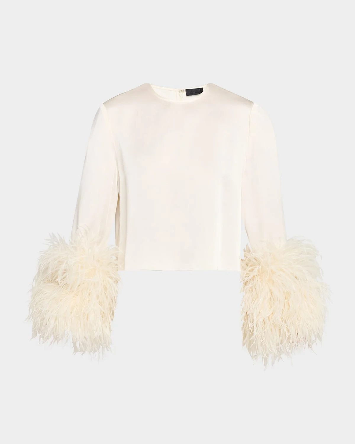 LAPOINTE satin top embellished with ostrich feather trimmed cuffs Crew neckline Long sleeves Loose fit Cropped length Invisible back zip Acetate/viscose Professional cleaning recommended Made in Italy