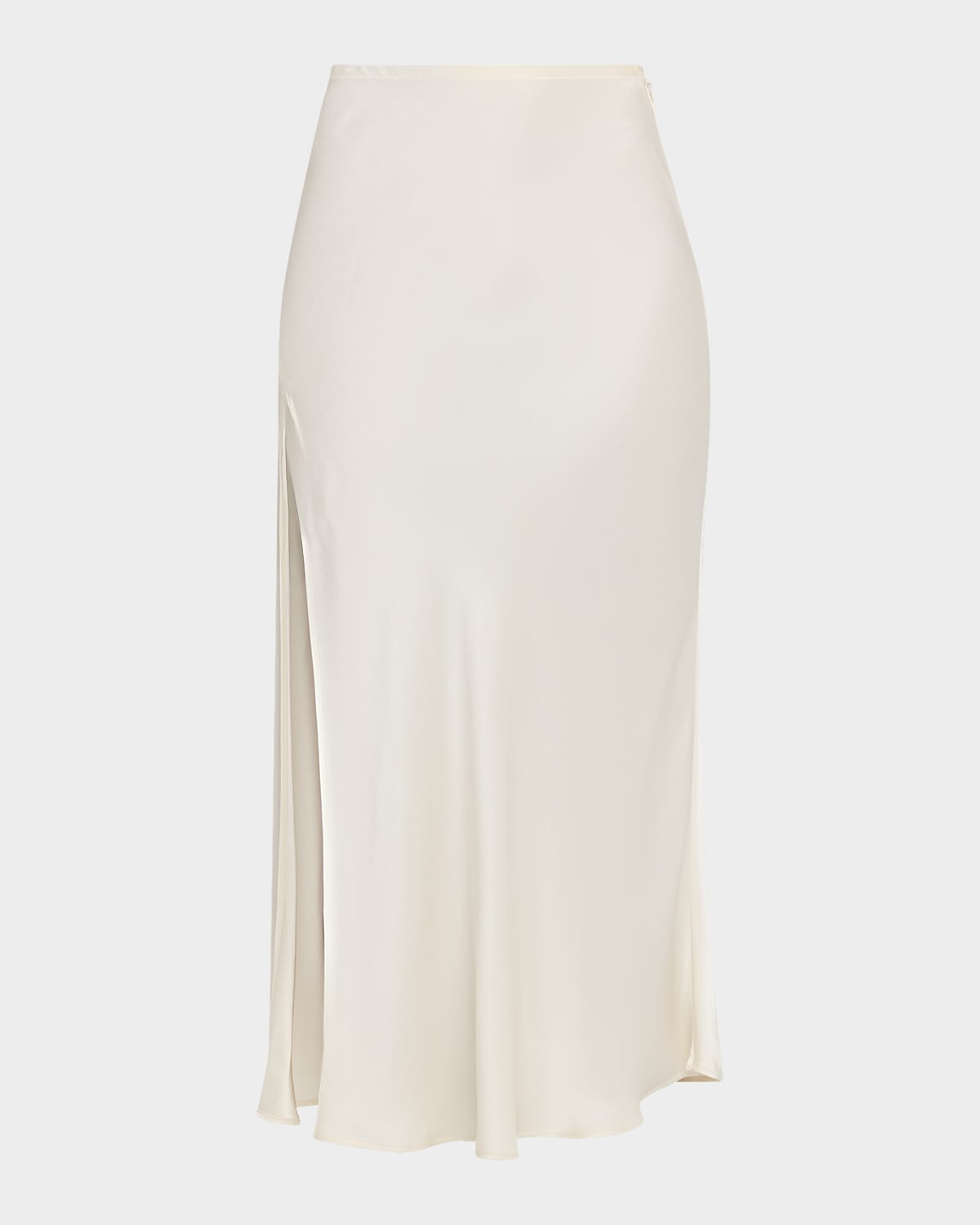 - LAPOINTE satin bias skirt featuring a side slit - Mid waist - Hem falls below the knee - Skirt falls straight from hip to hem - Invisible side zip - Acetate/viscose - Made in USA