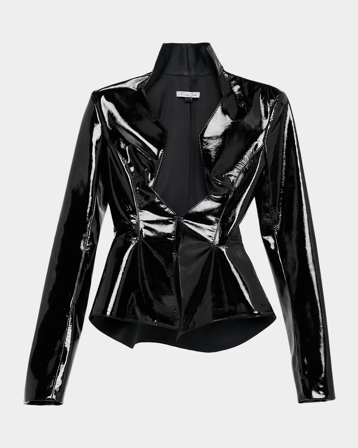 LaQuan Smith jacket is tailored in patent leather featuring a zigzag plunging neckline and a peplum flounce hem Stand collar; singlebreasted front Long sleeves Padded shoulders Fitted Flare hem Hip length Hookandeye closure Leather Made in USA