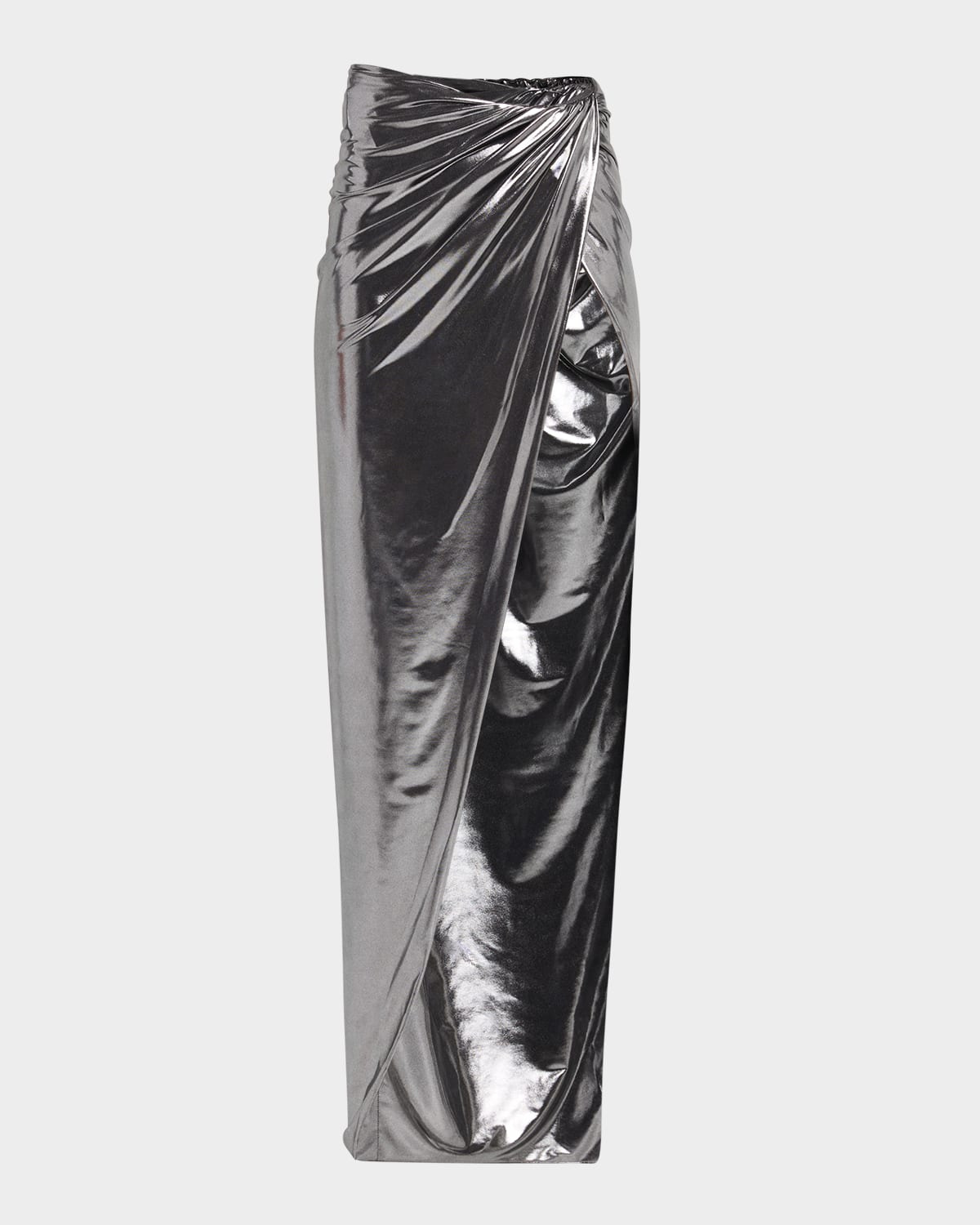 LaQuan Smith skirt is crafted of a metallic jersey twisted at the waist creating a thigh high side slit High waist Bodyskimming silhouette Full length Pullon style Polyester/elastane Made in USA