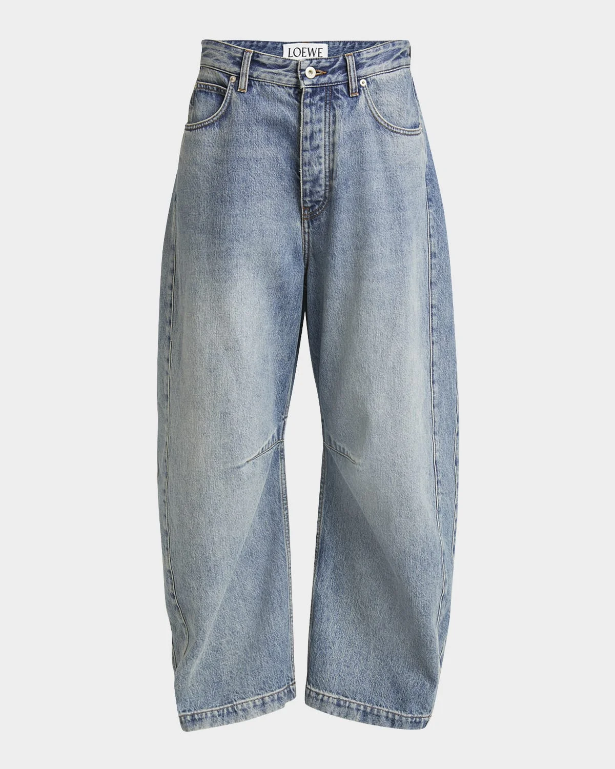 Loewe jeans with an Anagram print and calfskin leather label Full length Mid rise sits high on hip Barrel legs Fivepocket style Button/zip fly; belt loops Cotton/polyester/leather Dry clean Made in Italy