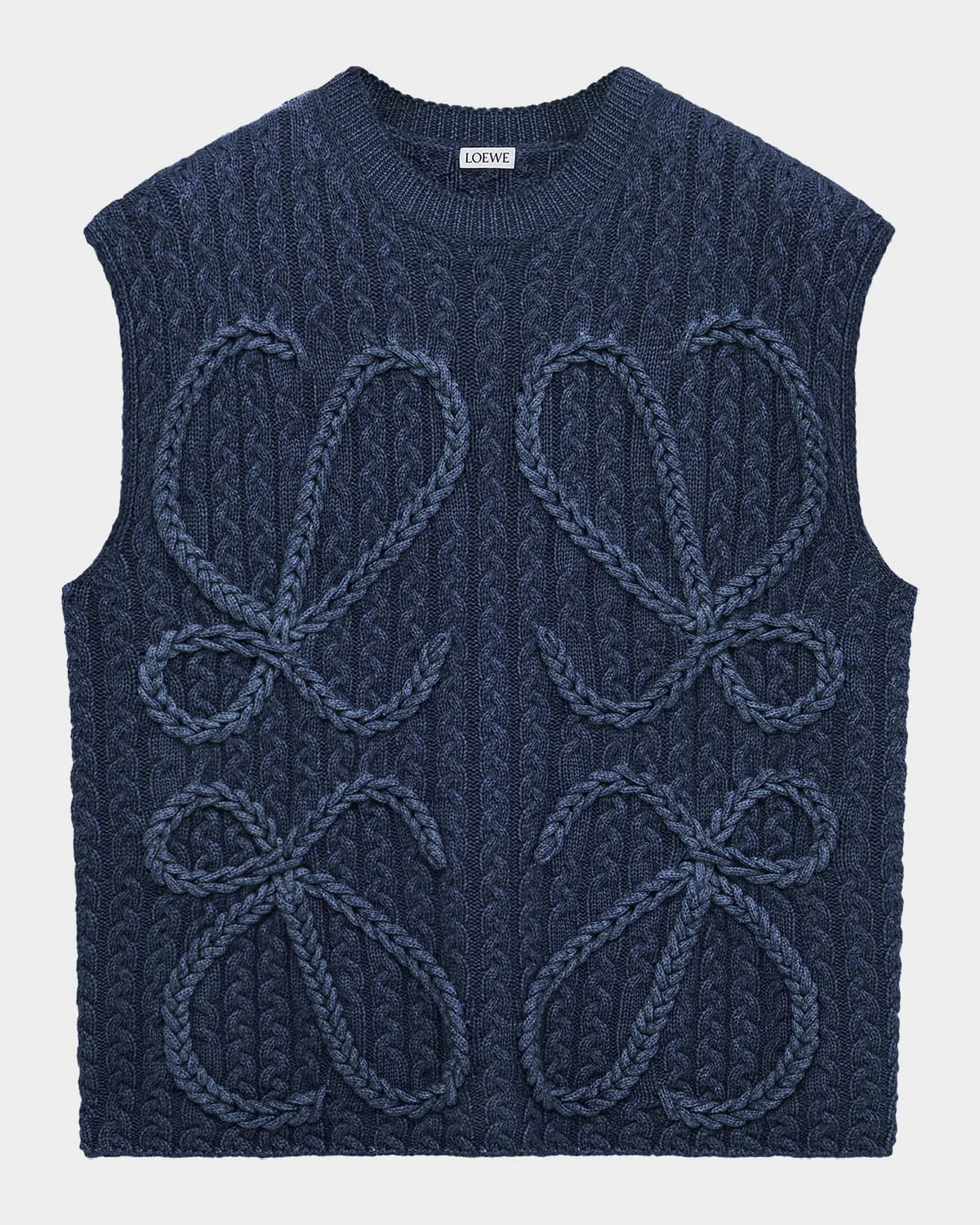 Crafted from wool-stretch cable knit, this vest from Loewe features a large anagram braided intarsia on the front Crew neckline Sleeveless Loose fit Hip length Ribbed hem Pullover style Wool/elastane Professional cleaning recommended Made in Italy SIZE & FITModel measurements: 5 & apos;10" tallModel is wearing a US size 4/Small