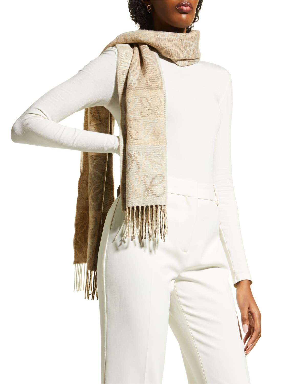 Scarf made of wool and cashmere in an allover anagram logo design Fringe trim Approx. 15.7"L x 70.9"W May be styled multiple ways Made in United Kingdom