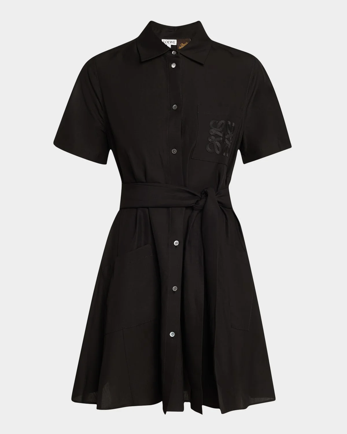 - Loewe shirtdress featuring a signature anagram embroidered chest pocket and a waist sash - Point collar; button front - Short sleeves - Self-tie belted waist - Hip patch pockets - A-line silhouette - Mini length - Viscose/linen/cotton - Dry clean - Made in Italy