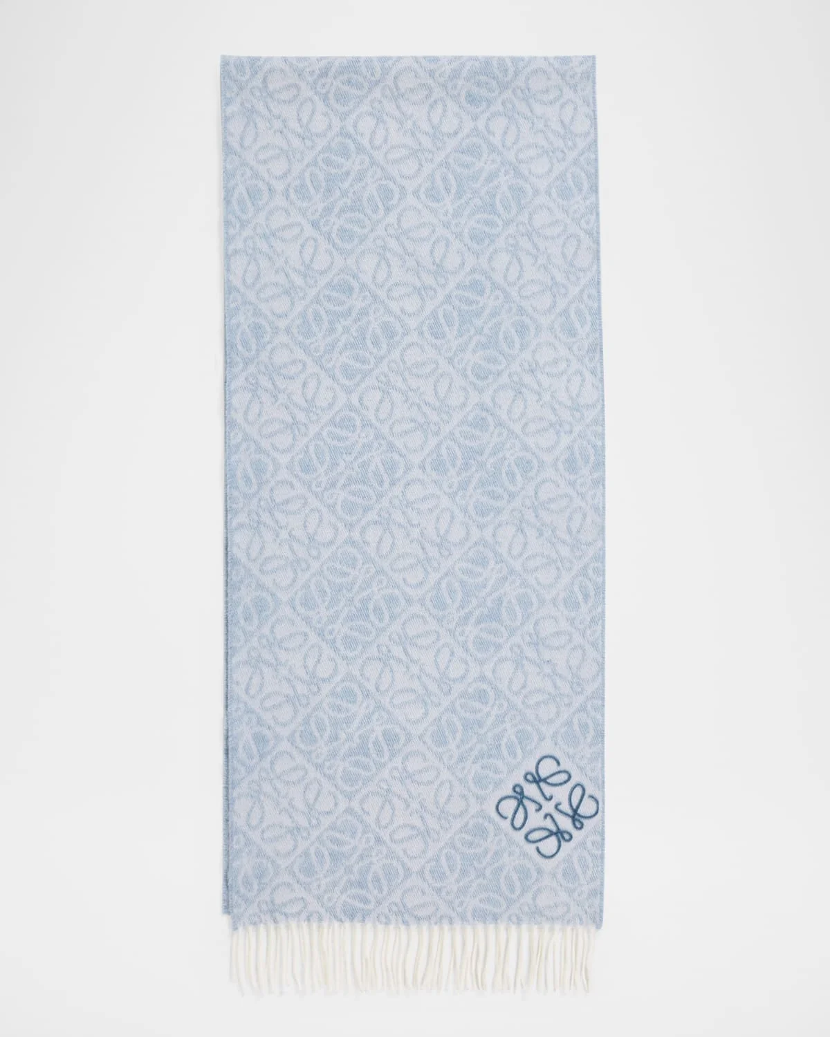 Loewe woolblend scarf printed in classic monogram motif Approx. 14.96"W × 70.87"L Fringe trim Can be styled in multiple ways Wool/cashmere Professional cleaning recommended Made in United Kingdom