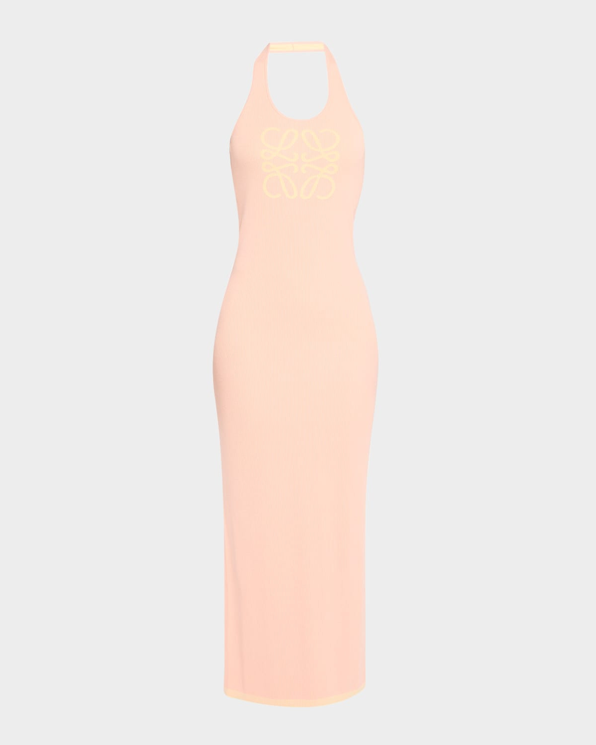 - Loewe ribbed knit tank dress featuring anagram chest intarsia and a side slit - Scoop halter neckline - Sleeveless - Sheath silhouette - Full length - Side slit - Slipover style - Cotton/viscose/polyester - Dry clean - Made in Italy
