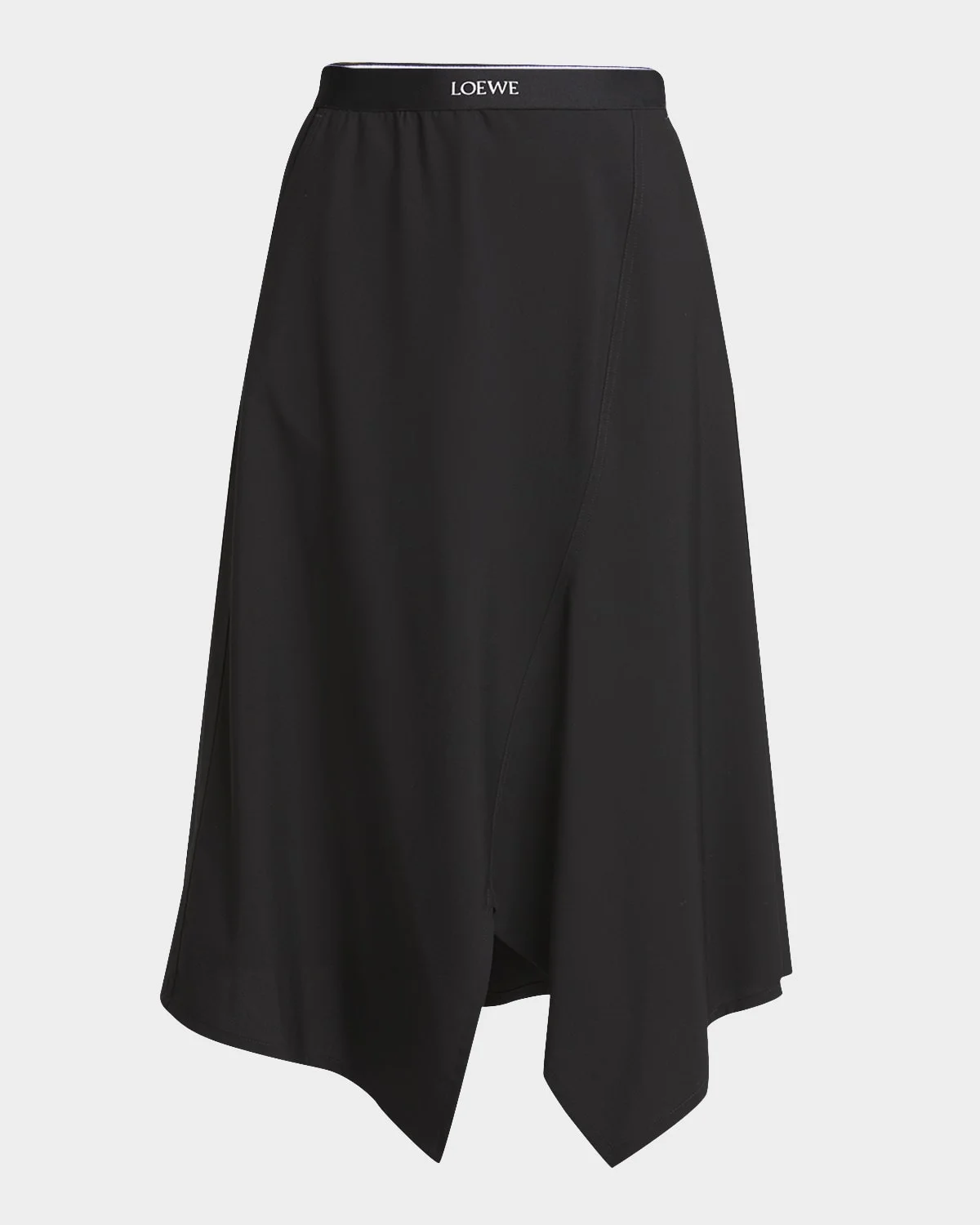 Loewe asymmetric midi skirt featuring logo detailing at the waistband & nbsp; High rise & nbsp; Side slip pockets & nbsp; Hem falls below the knee A-line silhouette Wool/cotton/nylon/polyamide Dry clean Made in Italy Model is 5 & apos;10"/177cm.