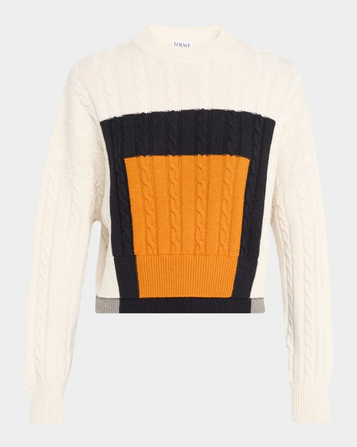 - Loewe cable knit sweater featuring a multi-square intarsia on the front and a layered-effect hem - Signature debossed anagram patch on the back - Crew neckline - Long sleeves - Drop shoulders - Boxy fit - Cropped length - Ribbed cuffs and hem - Pullover style - Wool - Made in Italy