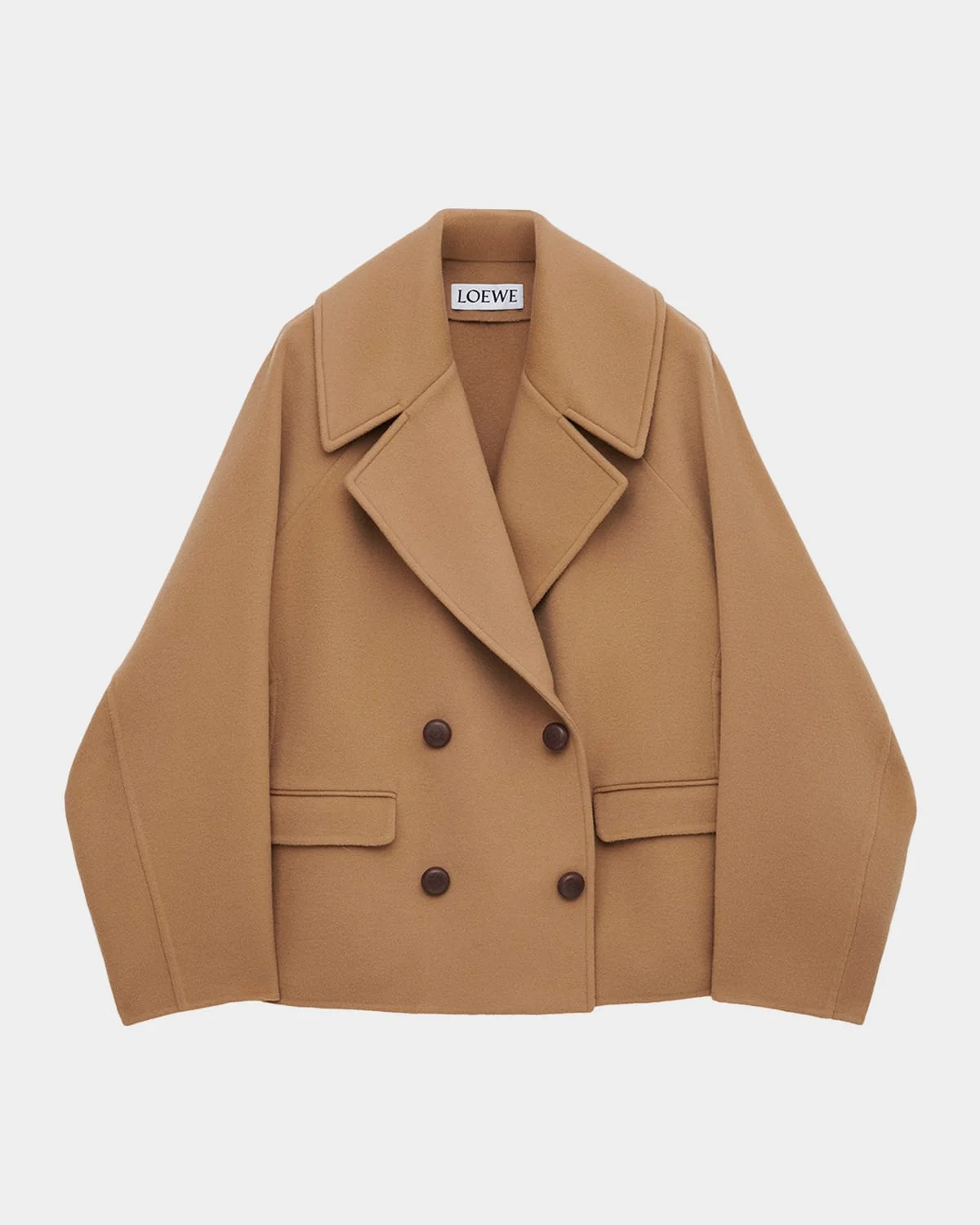Crafted from brushed wool, this coat from Loewe features cocoon-like sleeves and leather-covered anagram pebble buttons Notch lapels; double-breasted front Long raglan cocoon sleeves Hip flap pockets Oversized & nbsp;fit Hem falls below the hip Button closure Wool Made in Italy SIZE & FITModel measurements: 5 & apos;10" tallModel is wearing a US size 4/Small