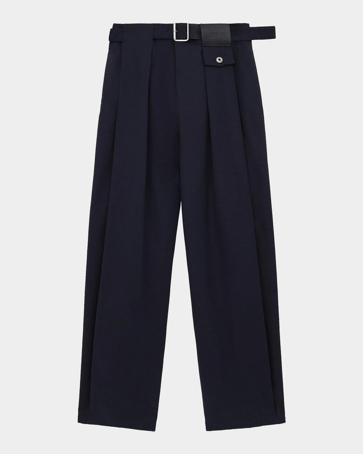 These trousers by Loewe are finished with pleated details, visible stitching, and a detachable belt for enhanced practicality High rise Full length Straight legs Button/zip fly; belt loops with embossed leather logo patch Cotton/silk/leather Professional cleaning recommended Made in Italy
