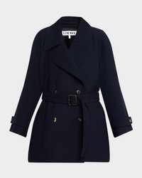 Loewe coat is crafted of a thick woolblend twill adorned with a self belt Notch lapels; doublebreasted front Long sleeves; buttontab cuffs Belted waist Hip welt pockets Oversized fit Hem falls below the hip Wool/viscose/silk Made in Italy