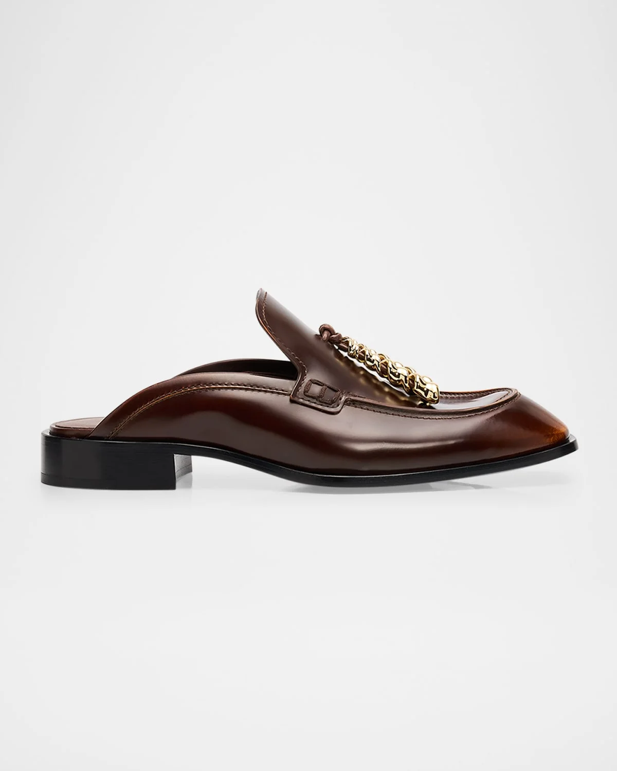 These "Edge" mules from Loewe are crafted of leather and feature a loafer design with gold-tone hardware detailing on the vamp 0.75 in / 20 mm stacked flat heel Moc toe Notched vamp Slip-on style Leather lining and outsole Professional cleaning recommended Made in Italy