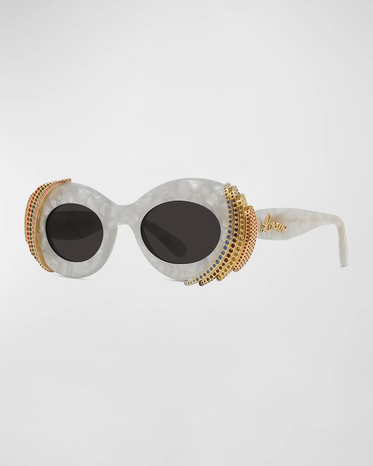 Loewe oval sunglasses in acetate and metal & nbsp; Embellished with faux crystals (glass) Lens/bridge/temple (in mm): 47-22-140 Saddle nose bridge Curved logo on temples & nbsp; Thin, tapered arms & nbsp; Hand wash 100% UVA/UVB protection Made in Italy Proposition 65 warning for California residents