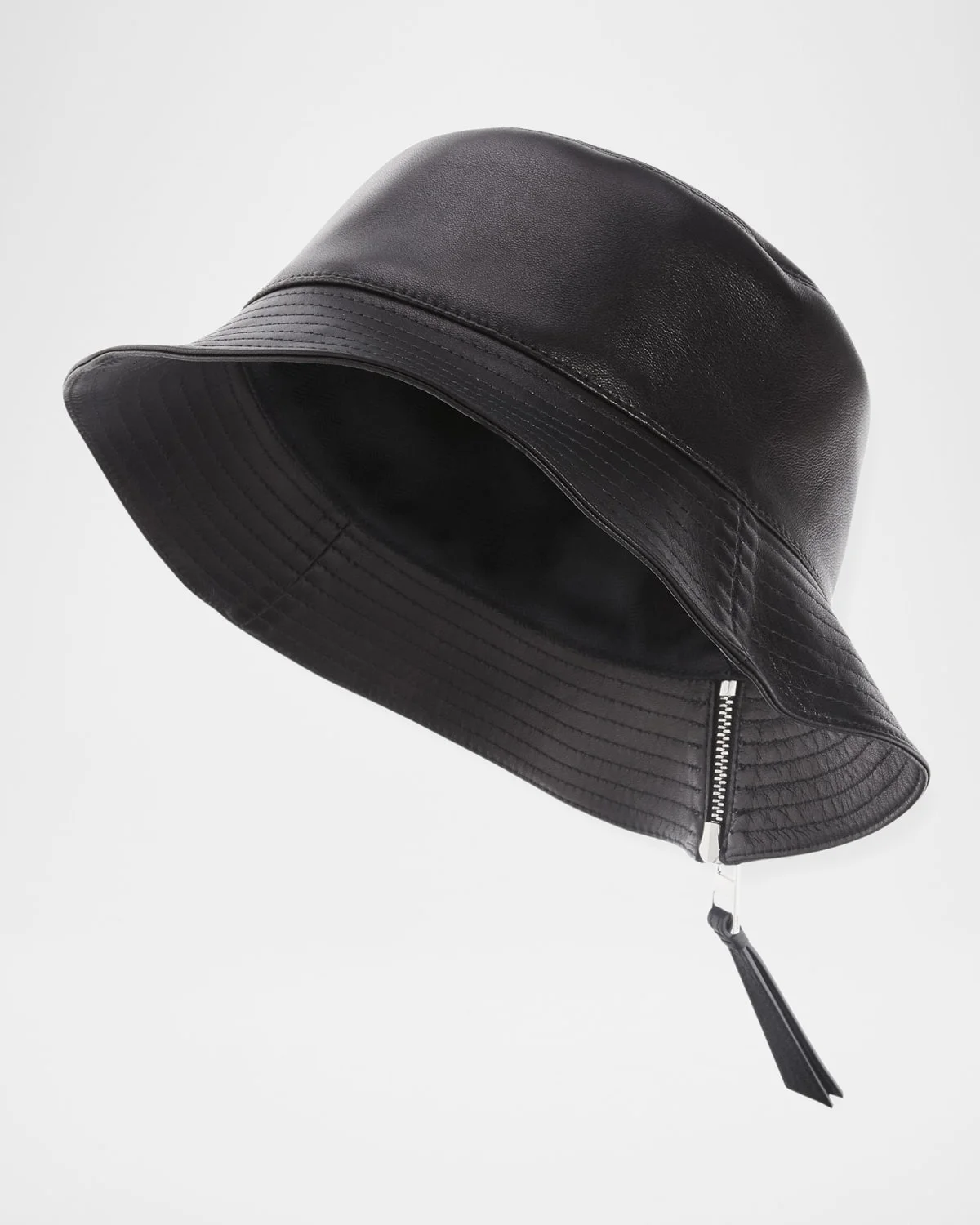 Loewe fisherman leather bucket hat with Anagram logo patch Features zip accent at brim Flat crown Downturn brim Cotton lining Made in Portugal