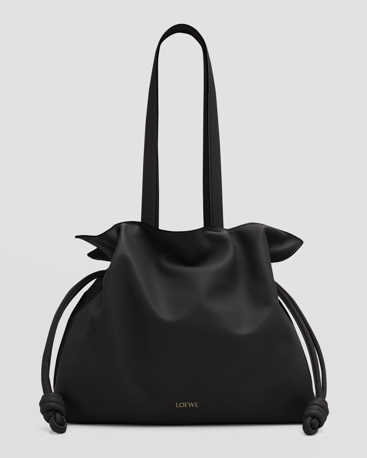 - Loewe "Flamenco" shoulder bag in leather, cotton, and linen - Shoulder straps - Can be worn as a shoulder or clutch bag - Side drawstring closure; magnetic top closure - Interior, one zip pocket - Approx. 11.3"H x 14.8"W x 5.5"D - Made in Spain