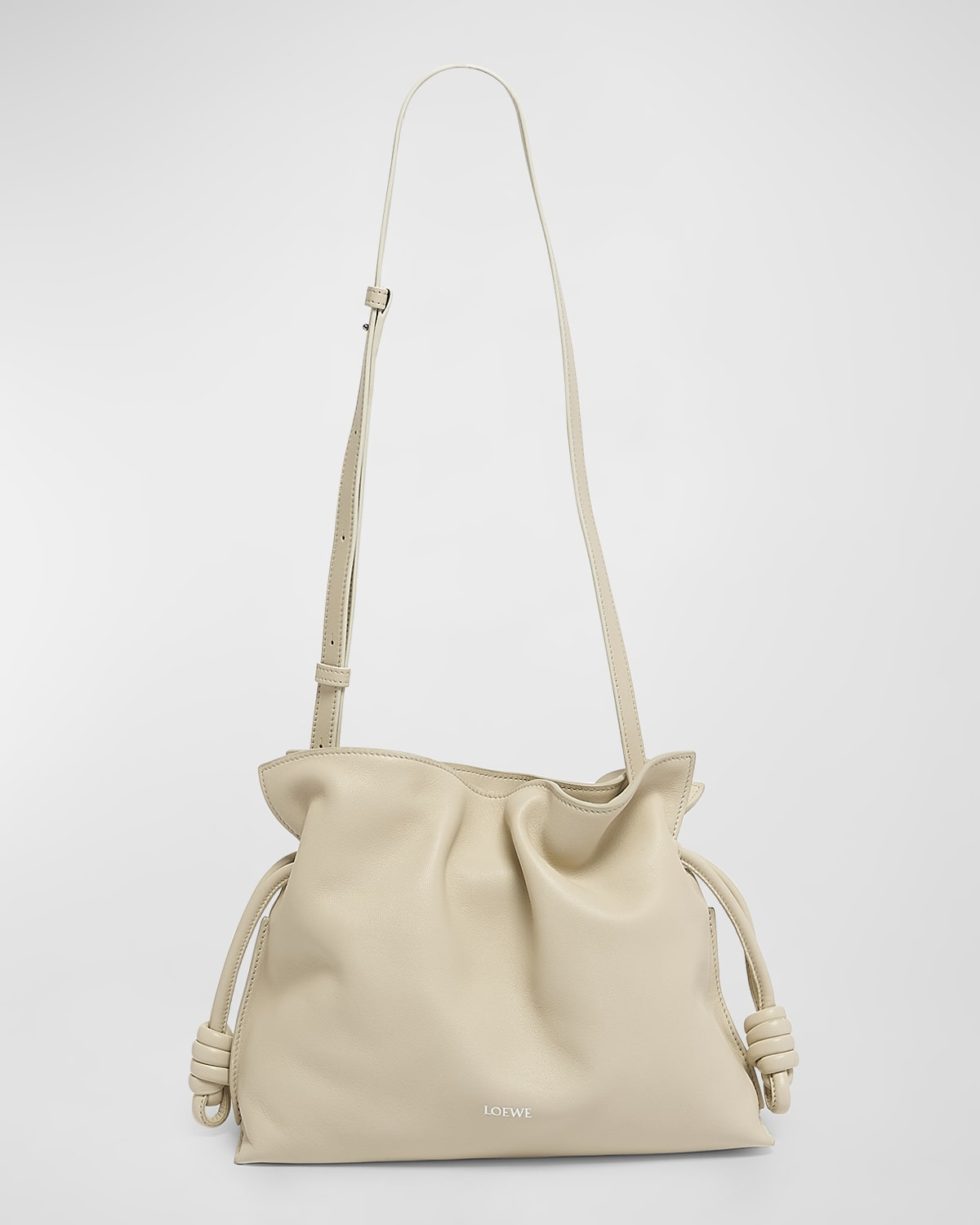 - Loewe "Flamenco" clutch bag in leather - Features a golden or silver embossed Loewe logo - Detachable shoulder strap - Can be worn as a clutch or shoulder bag - Ruched top with magnetic closure; side drawstring closure - Suede lining - Approx. 9.6"H x 11.7"W x 4.1"D - Made in Spain
