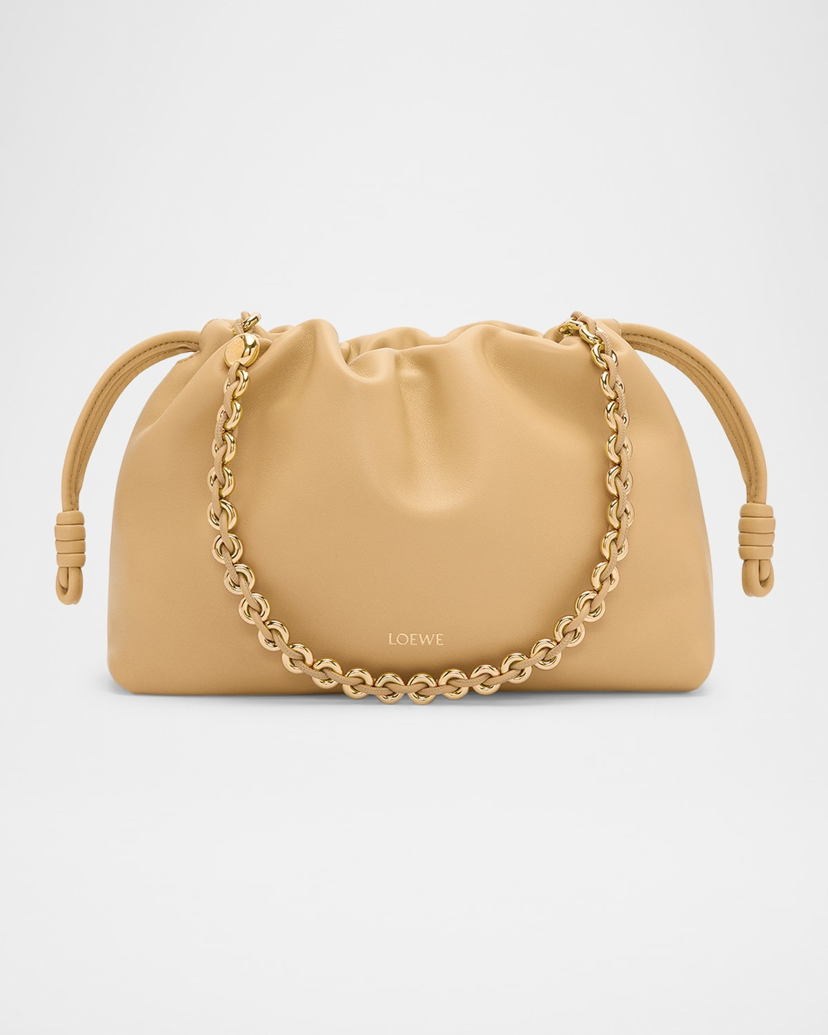 - Loewe "Flamenco" crossbody bag in leather - Chain top handle - Crossbody strap - Can be worn as a top handle or crossbody bag - Ruched drawstring and magnetic closures - Approx. 7.8"H x 11.7"W x 4.1"D - Made in Spain