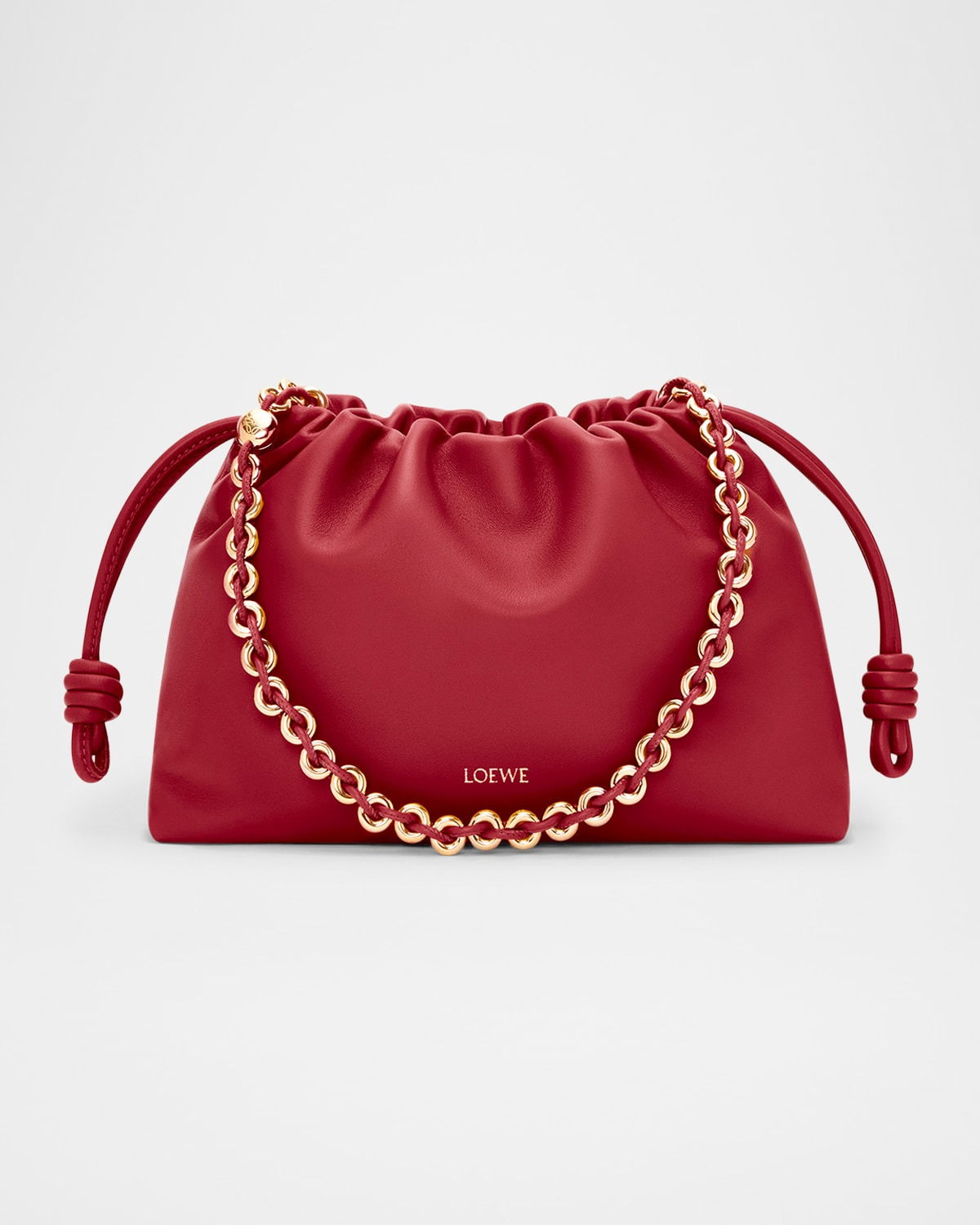 - Loewe "Flamenco" crossbody bag in leather - Chain top handle - Crossbody strap - Can be worn as a top handle or crossbody bag - Ruched drawstring and magnetic closures - Approx. 7.8"H x 11.7"W x 4.1"D - Made in Spain