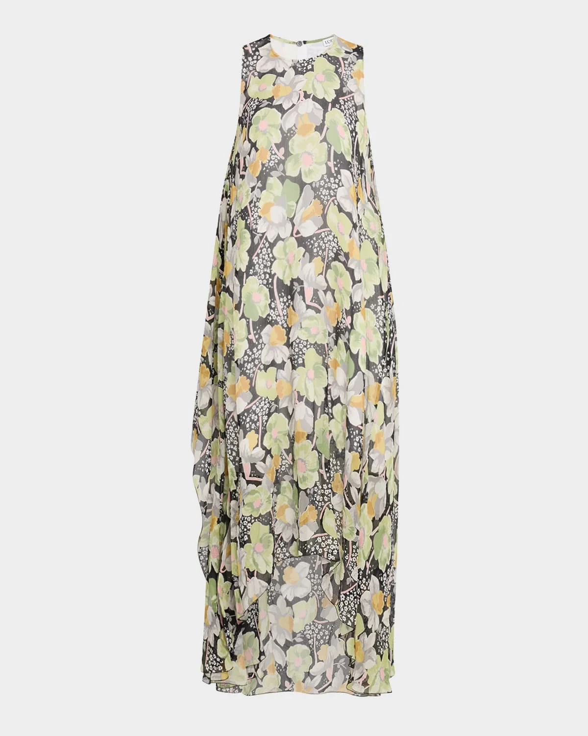 - Loewe crinkle chiffon dress featuring a flower print and a high-low hem - Round neckline; keyhole back - Sleeveless - Shift silhouette - Full length - High-low hem - Slipover style - Silk - Made in Spain