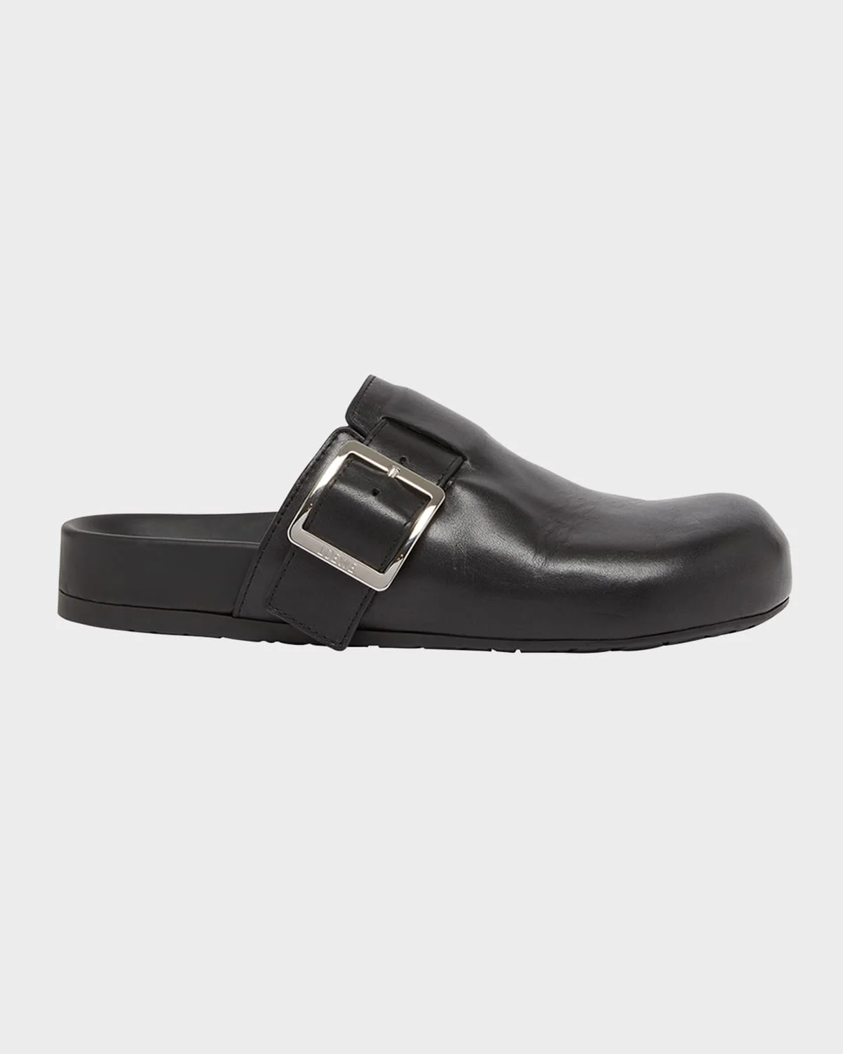 Loewe mules in smooth calf leather and polyurethane Flat heel Round toe Notched vamp with golden buckle accent Easy slide style Lightweight, sturdy TPU outsole Made in Italy