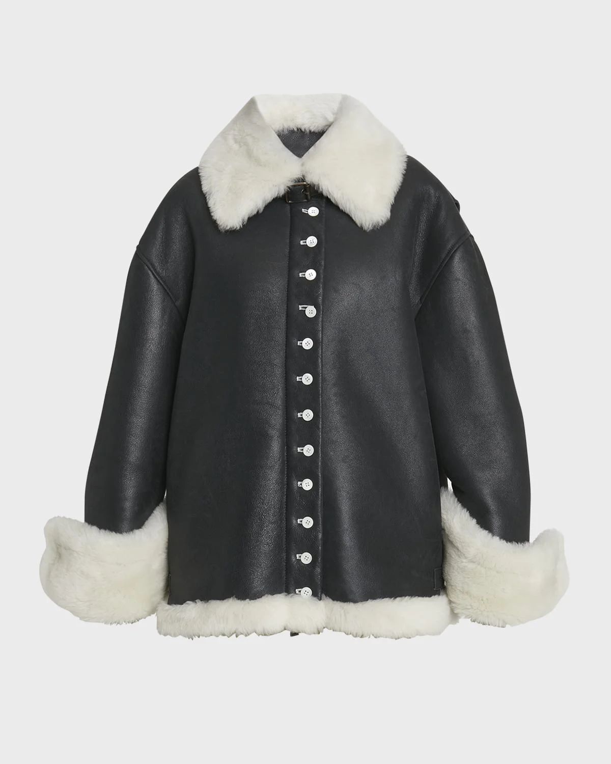 Loewe leather buttonfront jacket features a lamb shearling (Italy) lining and motherofpearl buttons Spread collar Long sleeves Midlength Loose fit Shearling/lambskin leather/motherofpearl Made in Italy