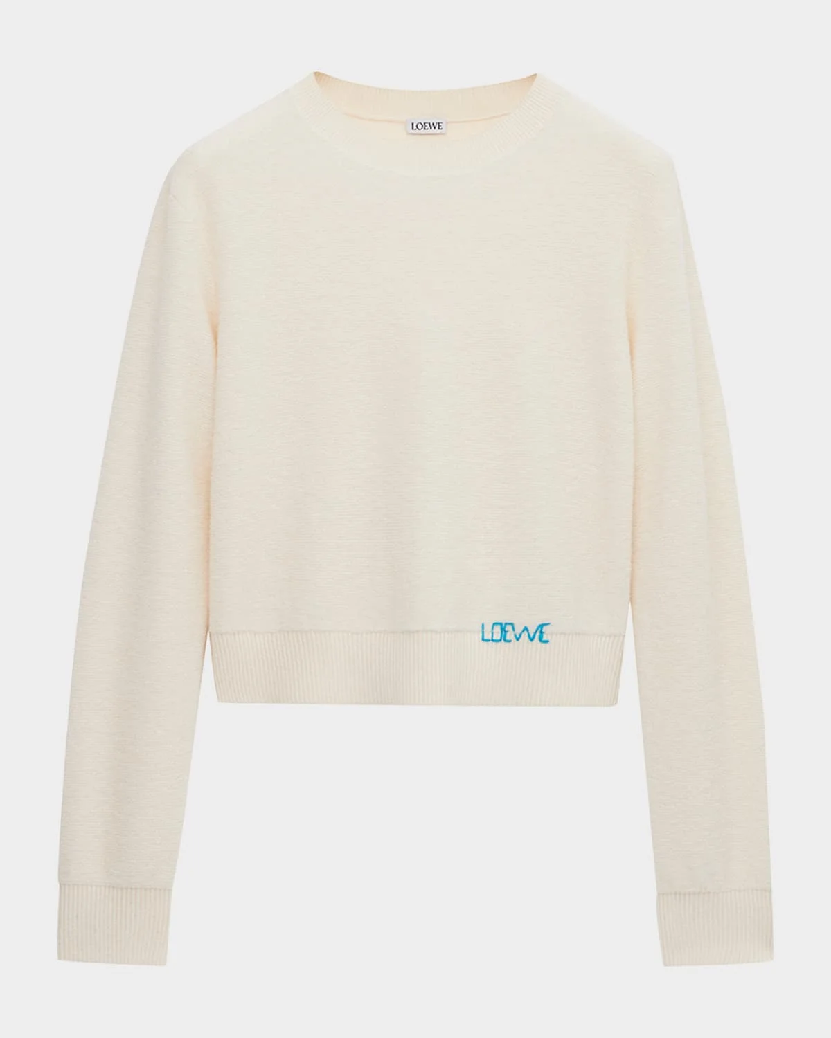 Loewe sweater is crafted of a warm wool knit featuring a contrast handstitched logo on the hip Crew neckline Long sleeves Relaxed fit Ribbed cuffs and hem Pullover style Wool/acrylic Made in Italy