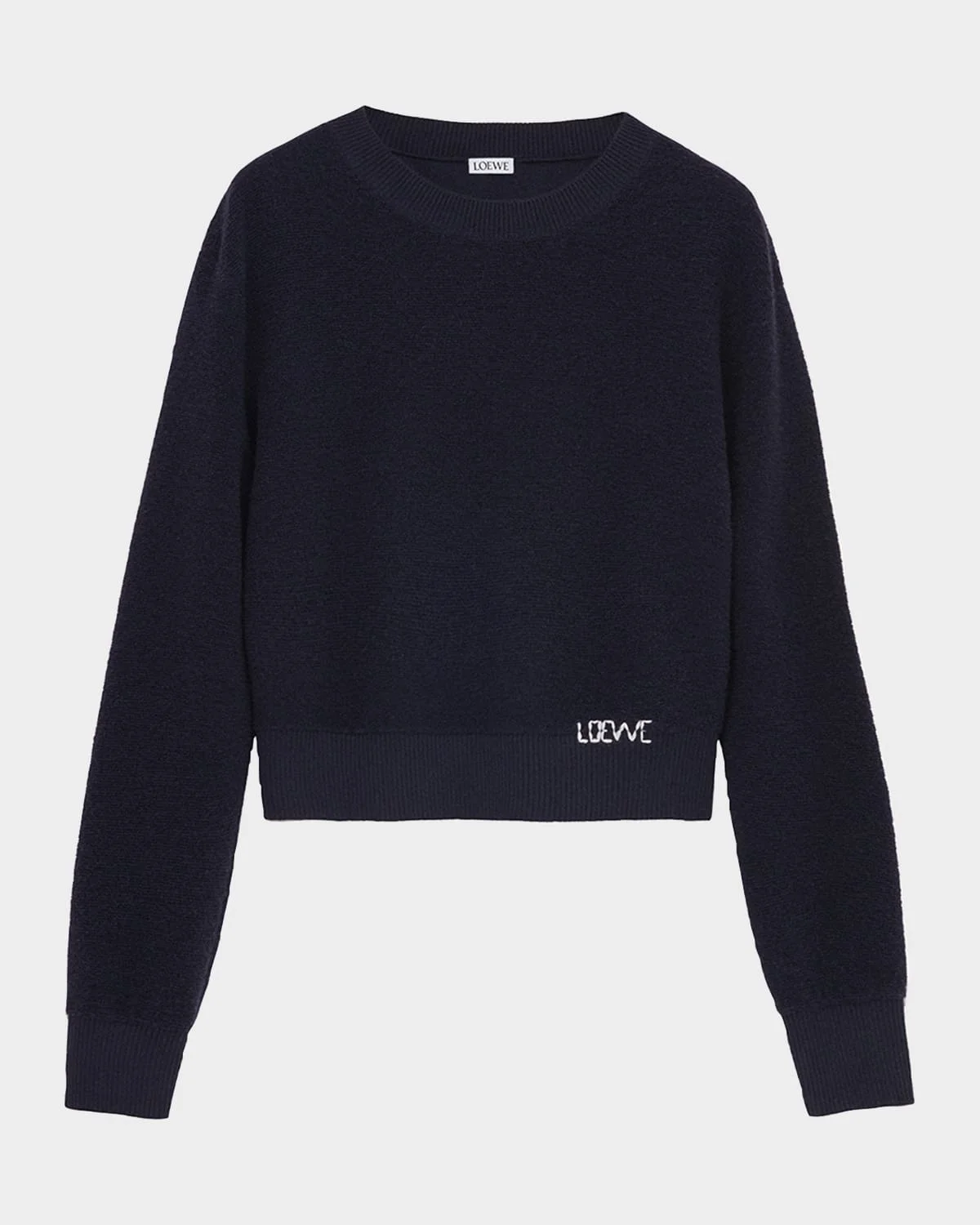 Loewe sweater is crafted of a warm wool knit featuring a contrast handstitched logo on the hip Crew neckline Long sleeves Relaxed fit Ribbed cuffs and hem Pullover style Wool/acrylic Made in Italy