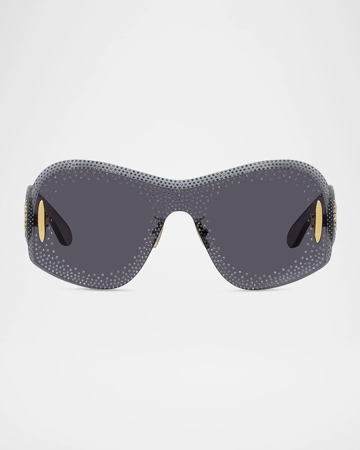 - Loewe "LW4167USW" studded shield sunglasses in metal - Eye/bridge/temple (in mm): 144-0-145 - Solid lenses - Adjustable nose pads - Anagram metal signature in relief on both temples - Thick, tapered legs - Metal/nylon/polyamide - 100% UVA/UVB protection - Made in Italy - Proposition 65 warning for California residents - This product contains perfluoroalkyl and polyfluoroalkyl substances (PFAS). For more information, please visit the manufacturer’s website.