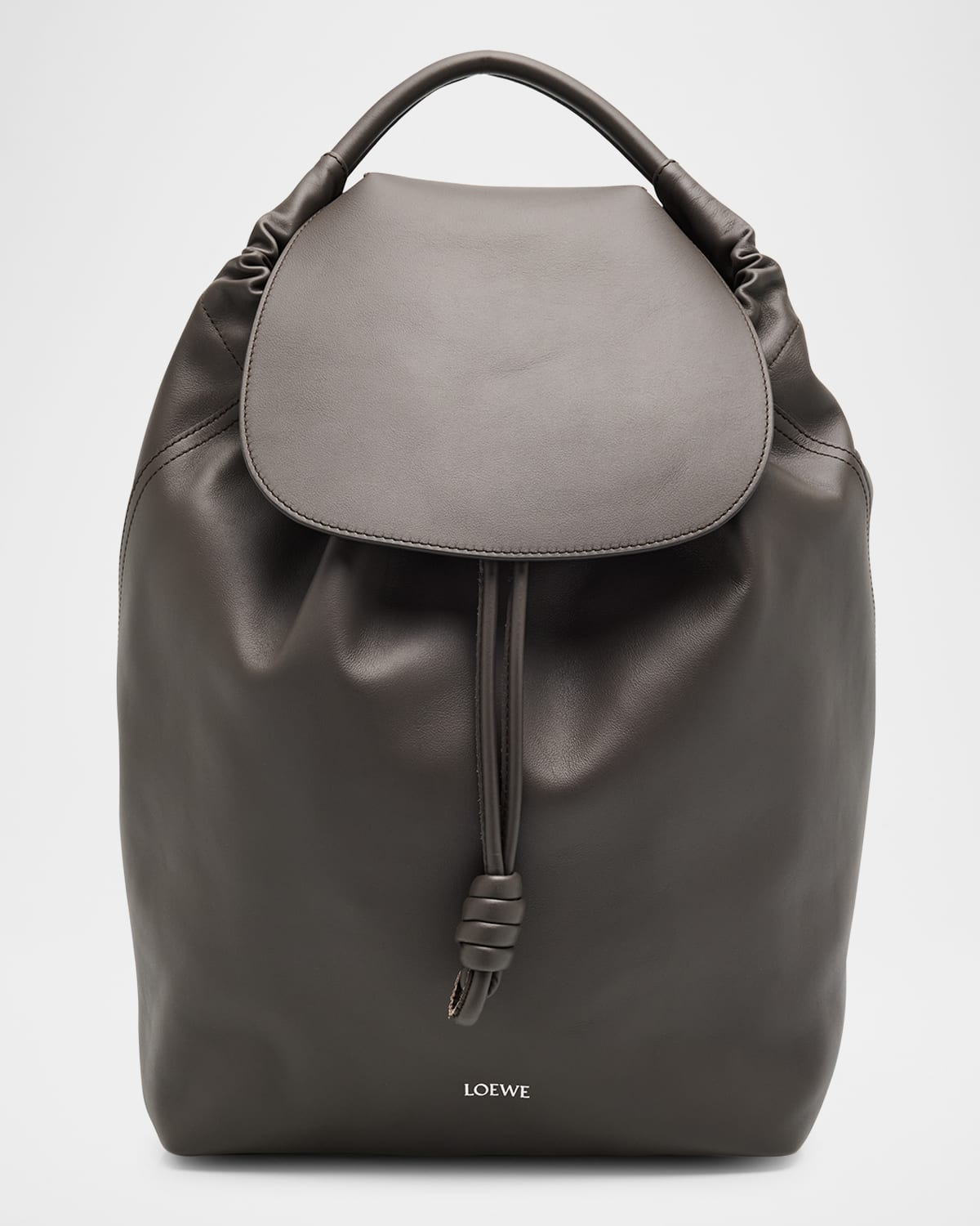 - Loewe "Flamenco" backpack in suede with smooth leather trim - Rolled top handle - Adjustable shoulder straps - Magnetic flap top - Drawstring closure - Side zipper pocket - Two internal pockets - Approx. 15.6"H x 14"W x 6.2"D - Cotton/linen lining - Made in Italy