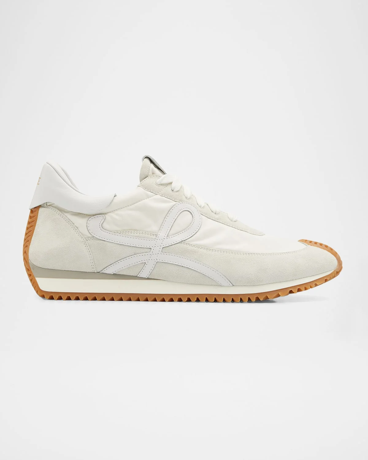 Loewe "Flow" runner sneakers in suede and leather and nylon. Flat heel with slight platform. Reinforced round toe. Laceup vamp. Stitched L logo at side. Textured rubber sole runs from toe to backstay. Made in Italy.