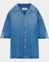 Loewe camp shirt in washed denim defined by the iconic Anagram along the elbows Notch collar Button front Short sleeves Oversized fit Cotton Dry clean Made in Italy