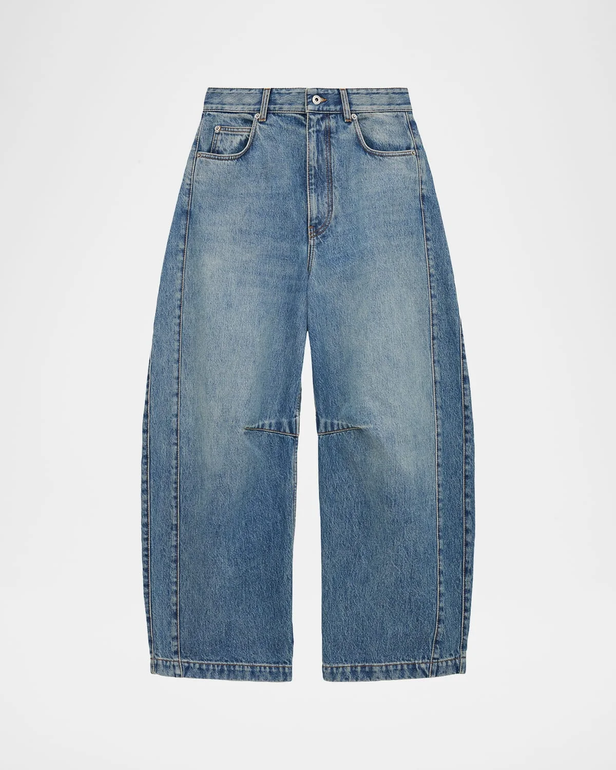 Loewe jeans are crafted of faded mediumwashed denim featuring side stripe panels and knee pleats creating a curved leg, signature anagram embroidered back pockets, and a leather logo patch on the back Mid rise sits high on hip Fivepocket style Curved barrel legs Full length Button/zip fly; belt loops Cotton/polyester/leather Made in Italy