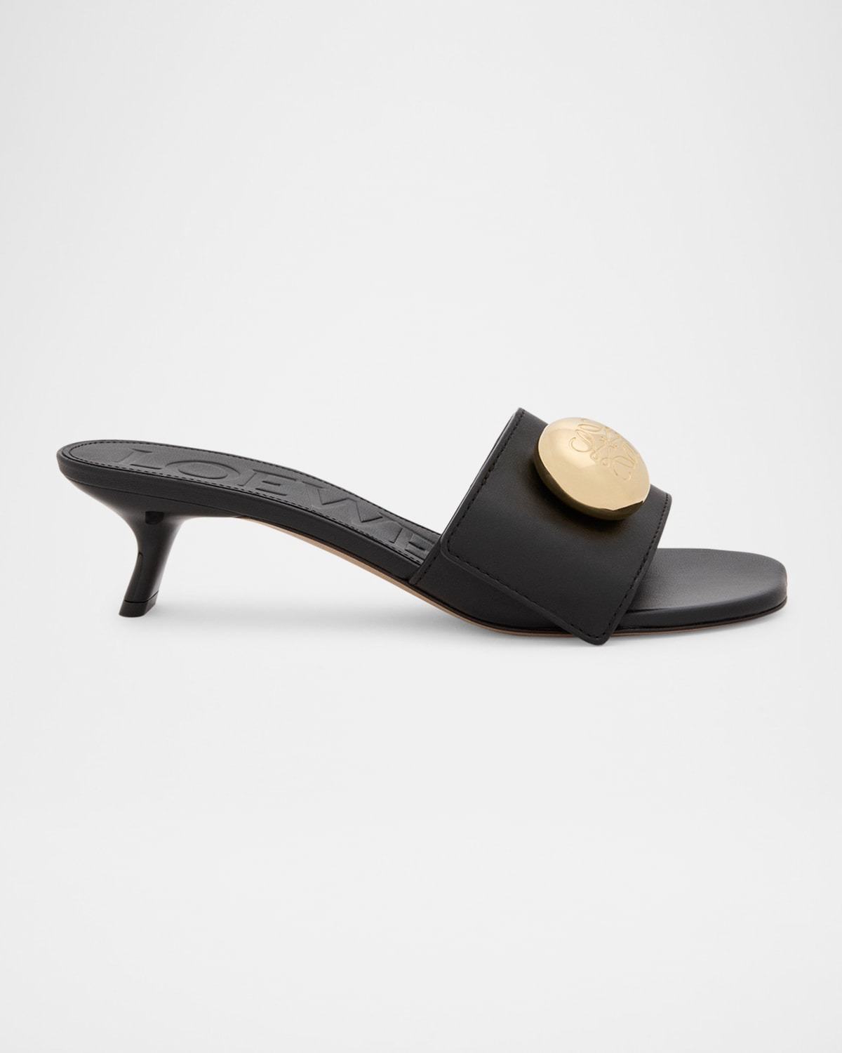 - Loewe "Pebble" calfskin leather sandals with a golden logo-engraved button accent - 1.75 in / 45 mm kitten heel - Open toe - Wide band vamp - Easy slide style - Leather outsole - Lining: Unlined - Made in Italy