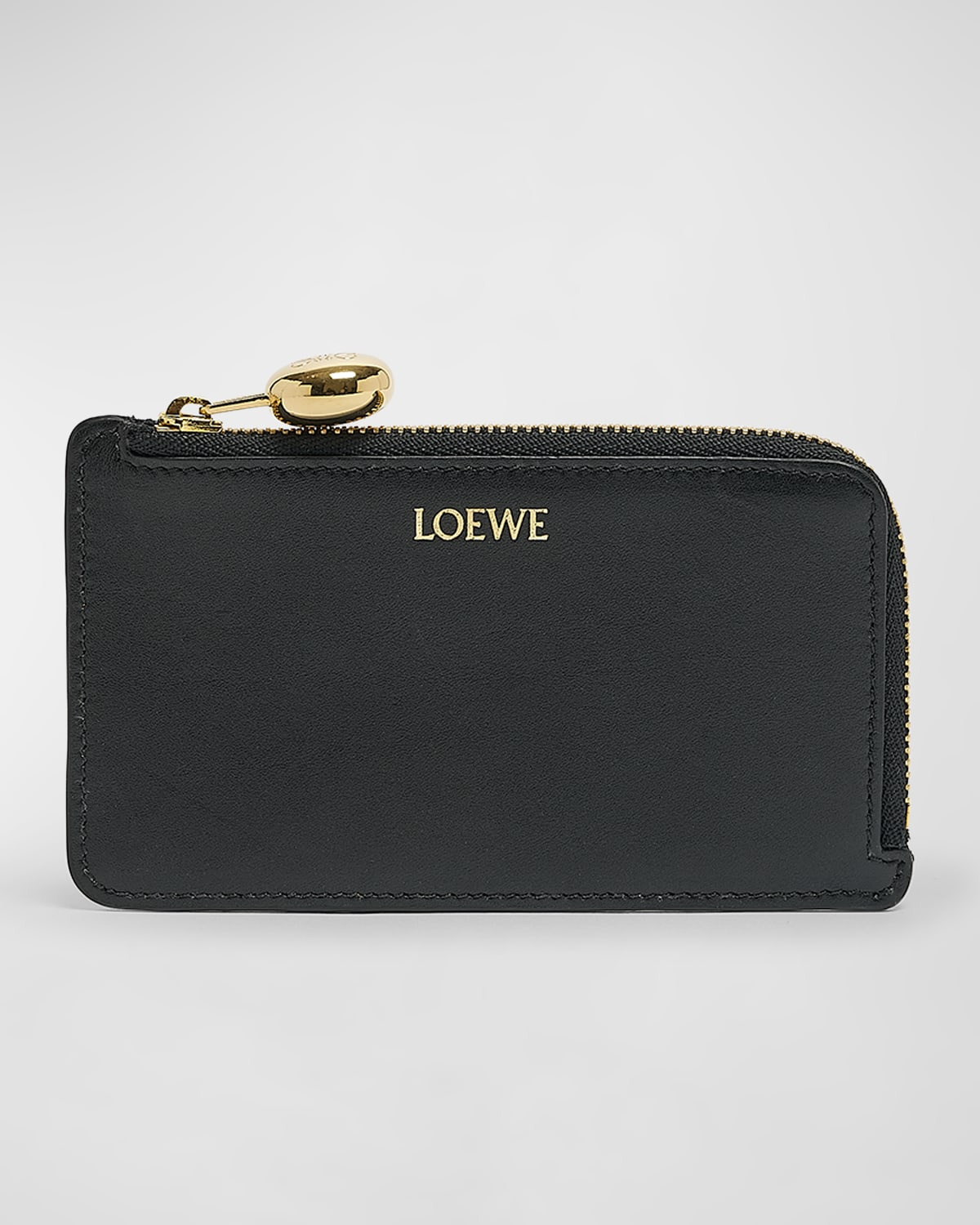 - Loewe card holder in shiny napa calfskin leather - Featuring a signature pebble zip top closure - Exterior, four card slots - Approx. 3"H x 5.1"W x 0.4"D - Made in Spain