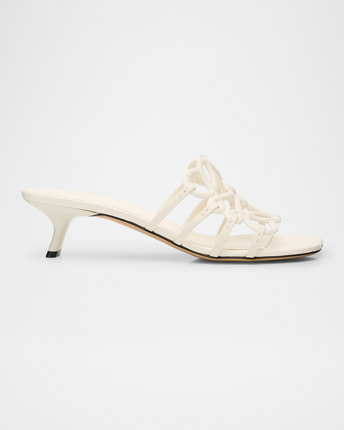 - Loewe calf leather sandals with petal anagram accent - 1.75 in / 45 mm kitten comma heel - Open toe - Caged vamp - Easy slide style - Leather outsole - Lining: Unlined - Professional cleaning recommended - Made in Italy