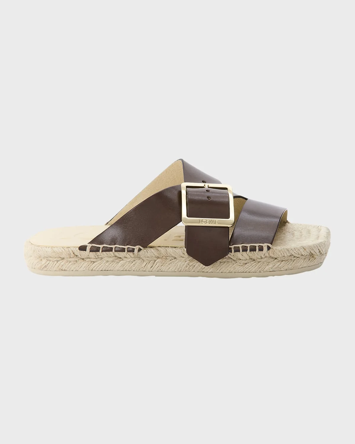Loewe "Petal" espadrille sandals in leather and polyurethane Flat braided jute heel Open square toe Single strap vamp with adjustable crisscross strap upper Slide style Lightweight, sturdy TPU outsole Lining: Unlined Professional cleaning recommended Made in Spain