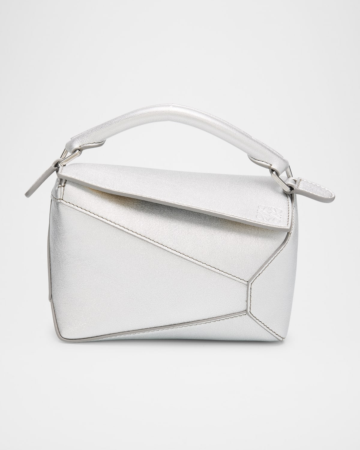 - Loewe puzzle edge top handle bag in metallic leather - Top handle - Detachable, adjustable crossbody strap - Can be worn as a top handle or crossbody bag - Fold-over flap top with zip closure - Approx. 4.9"H x 7.1"W x 3.1"D - Made in Spain