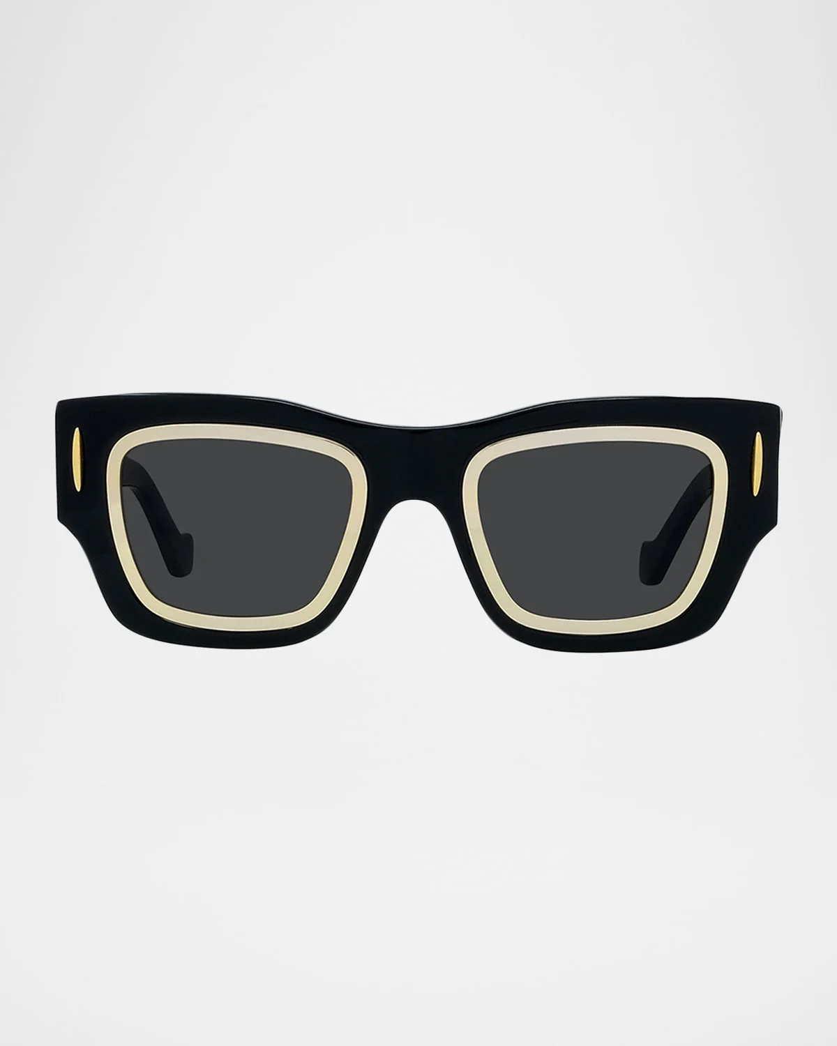 - Loewe rectangle-shaped sunglasses featuring a thick metal rim around the lenses and metal stitches on the front - Eye/bridge/temple (in mm): 53-17-145 - Solid lenses - Saddle nose bridge - Wide, tapered arms - Classic logo on the temples - Acetate - 100% UVA/UVB protection - Made in Italy - Proposition 65 warning for California residents