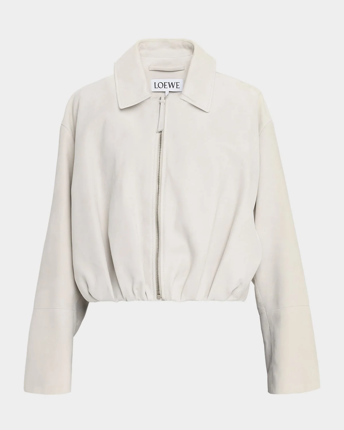 - A sculptural marvel in supple goatskin suede, this Loewe jacket showcases a modern balloon silhouette punctuated by elegant, hand-gathered asymmetric draping at the back - Point collar; zip front - Long sleeves - Side split pockets - Loose fit - Hip length - Suede/viscose - Dry clean - Made in Italy