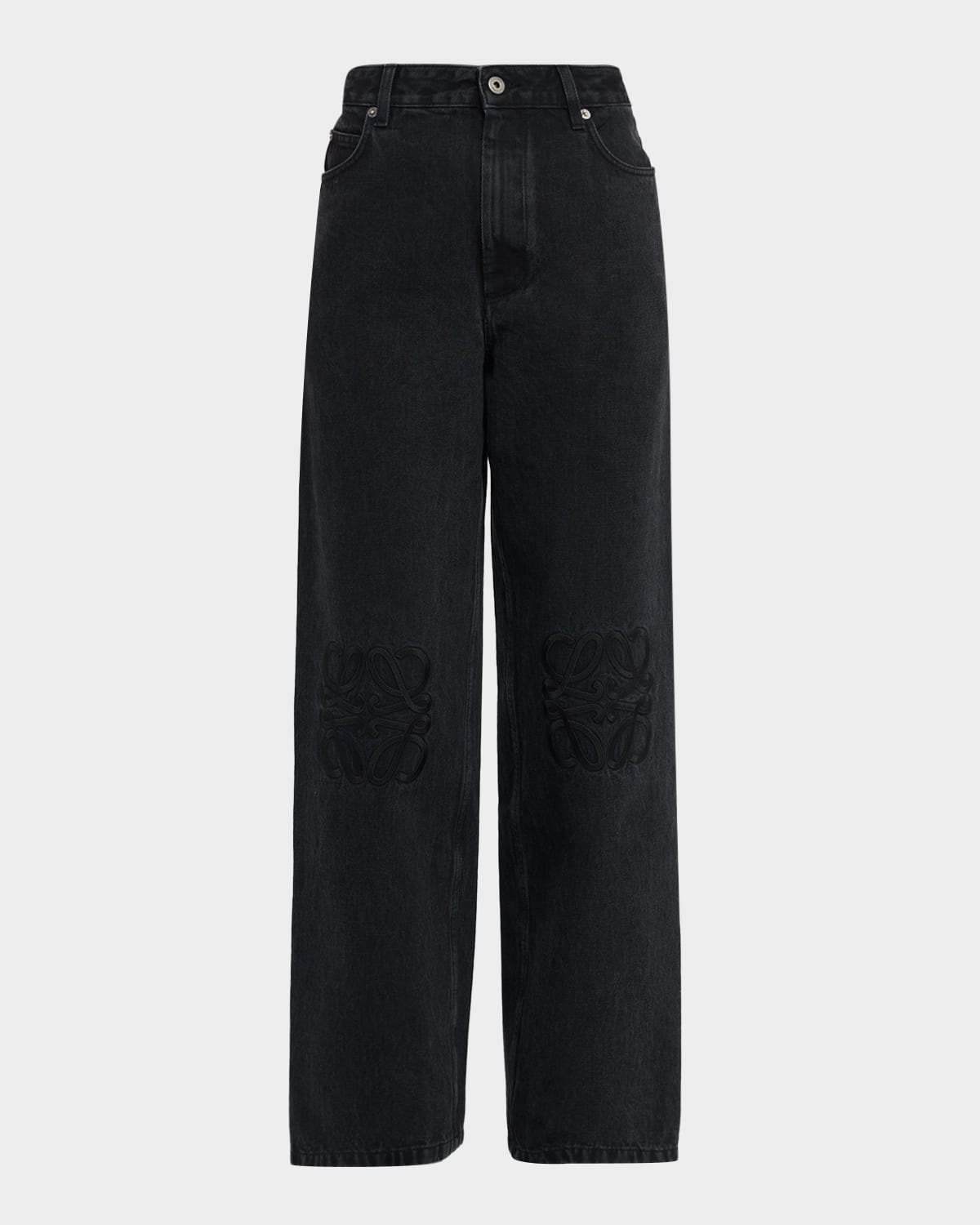 - Loewe baggy jeans featuring tonal anagram embroidered knees and a leather logo patch on the back - High rise - Side lsip pockets; back patch pockets - Wide legs - Full length - Button/zip fly; belt loops - Cotton/polyester/leather - Dry clean - Made in Italy