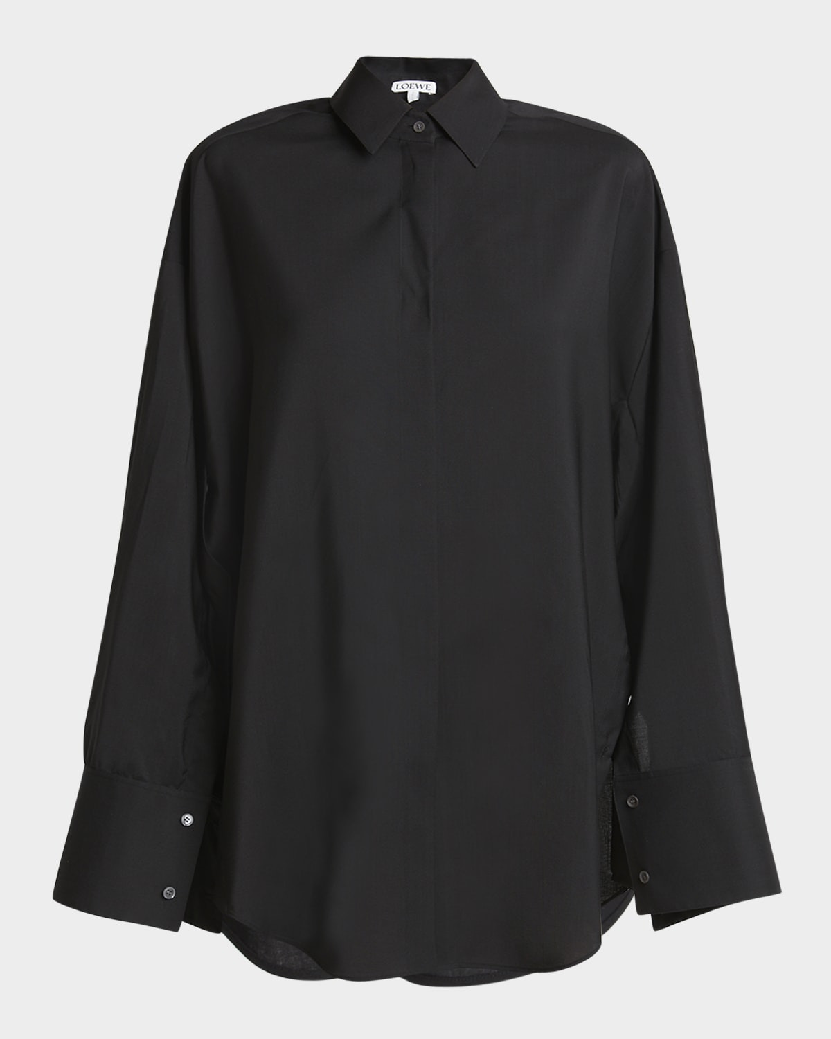 - Loewe solid blouse - Spread collar; concealed button placket - Long sleeves; button cuffs - Relaxed fit - Polyester/wool - Dry clean - Made in Italy - Model is 5'10"/177cm.