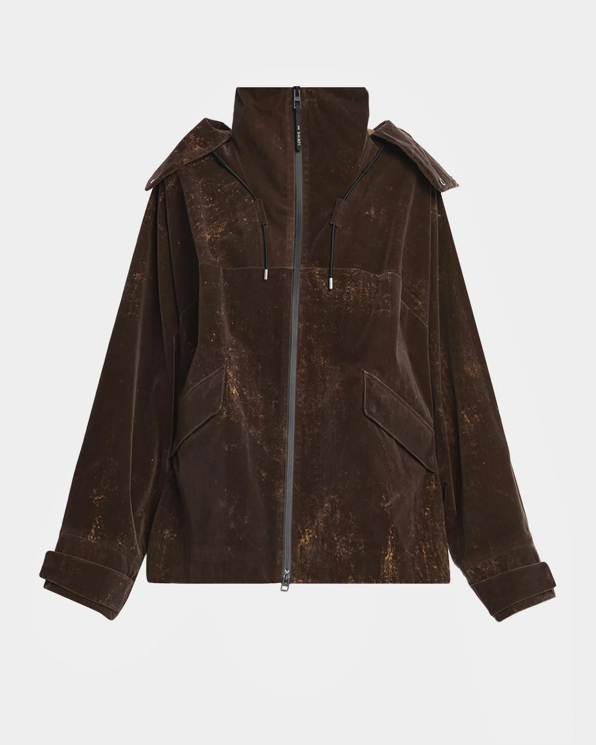 Designed for outdoor adventures, this Loewe jacket features a velvety, tactile flocked finish on a mediumweight technical shell. Designed in collaboration with On Drawstring hood with snap closure Long sleeves Snap button cuffs Zip flap pockets Reflective Anagram On print placed on the elbow and back Side zips for ventilation Drawstring hem Relaxed fit Twoway zip front closure Polyester/nylon/polyamide/elastane Professional cleaning recommended Imported