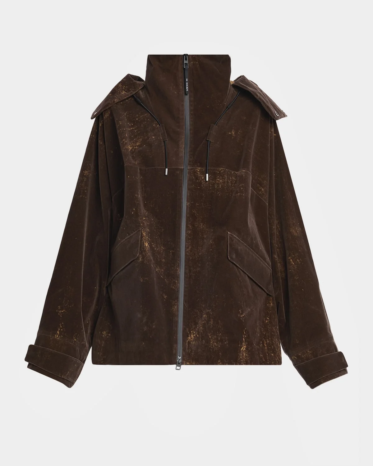 Designed for outdoor adventures, this Loewe jacket features a velvety, tactile flocked finish on a mediumweight technical shell. Designed in collaboration with On Drawstring hood with snap closure Long sleeves Snap button cuffs Zip flap pockets Reflective Anagram On print placed on the elbow and back Side zips for ventilation Drawstring hem Relaxed fit Twoway zip front closure Polyester/nylon/polyamide/elastane Professional cleaning recommended Imported
